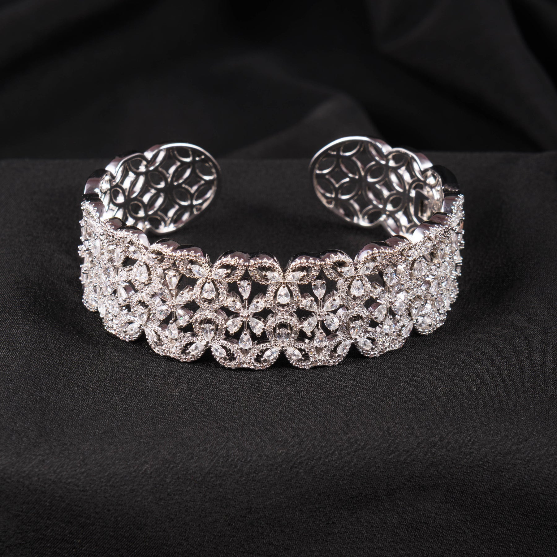 Description: This zirconia cuff bracelet features a luxurious spread of finely set stones that create a high-shine, glamorous look. The wide design makes a bold statement on the wrist, perfect for pairing with both ethnic and contemporary outfits.