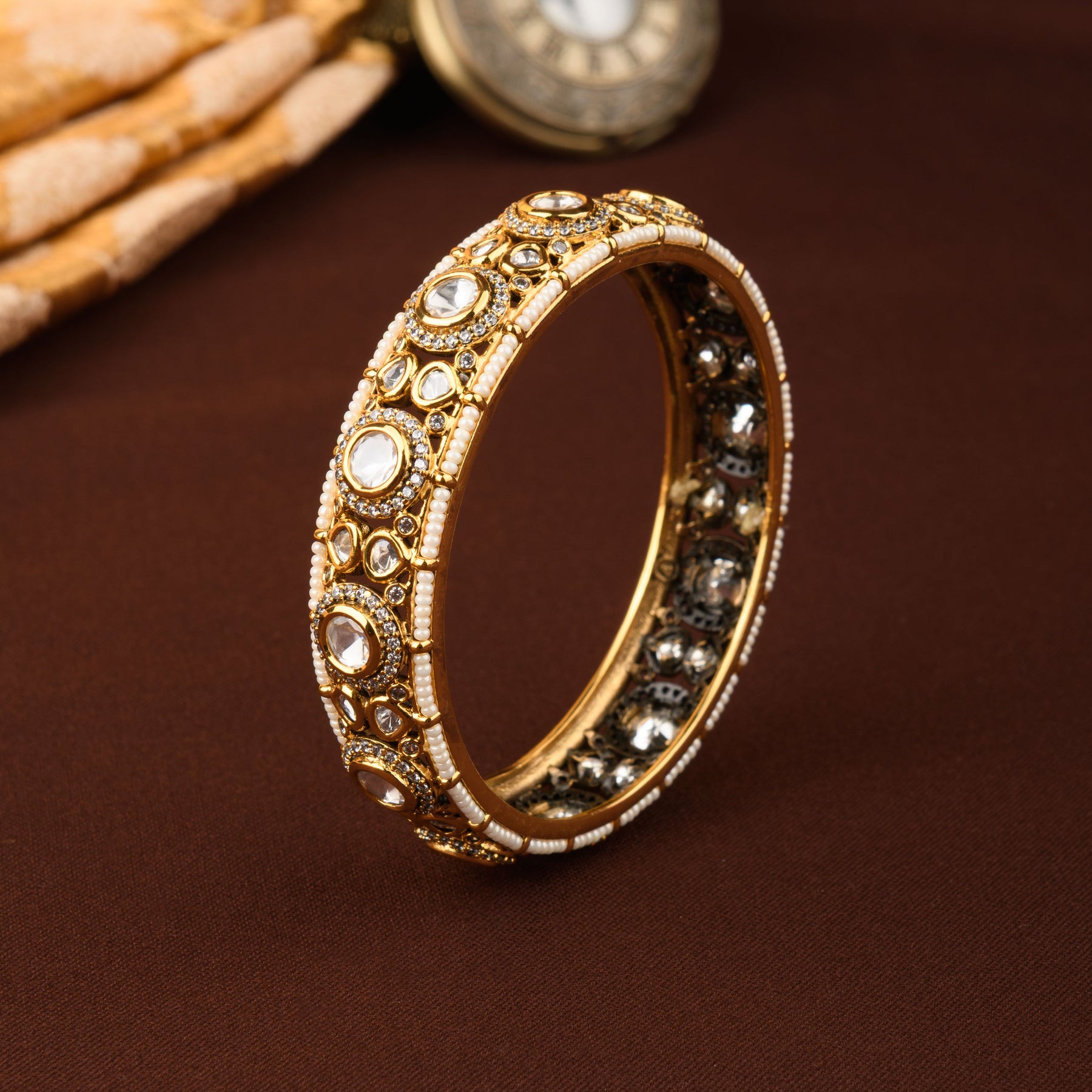 Description: These gold-plated bangles beautifully combine lustrous pearls with classic polki stones for a rich, elegant look. The intricate detailing adds a traditional charm, making them perfect for festive and wedding wear. A timeless addition to elevate any ethnic ensemble.