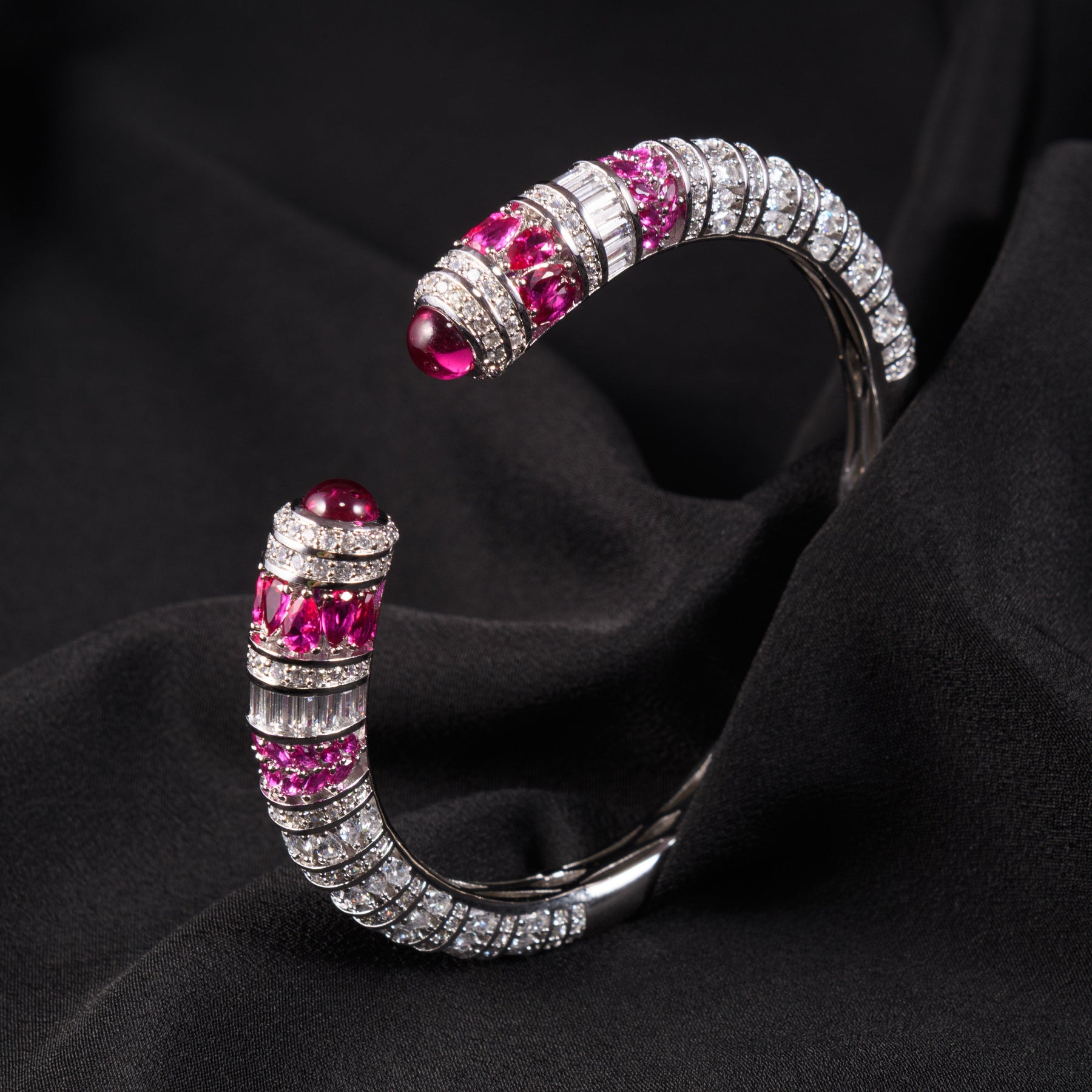 Description: This striking zirconia kada features a beautifully embellished design highlighted with coloured stone accents that add a vibrant touch. The intricate zircon setting creates a brilliant shimmer, making it perfect for festive occasions and celebrations. Crafted to sit comfortably on the wrist, it combines statement style with ease of wear. A standout piece for those who love jewellery with a blend of sparkle and colour.