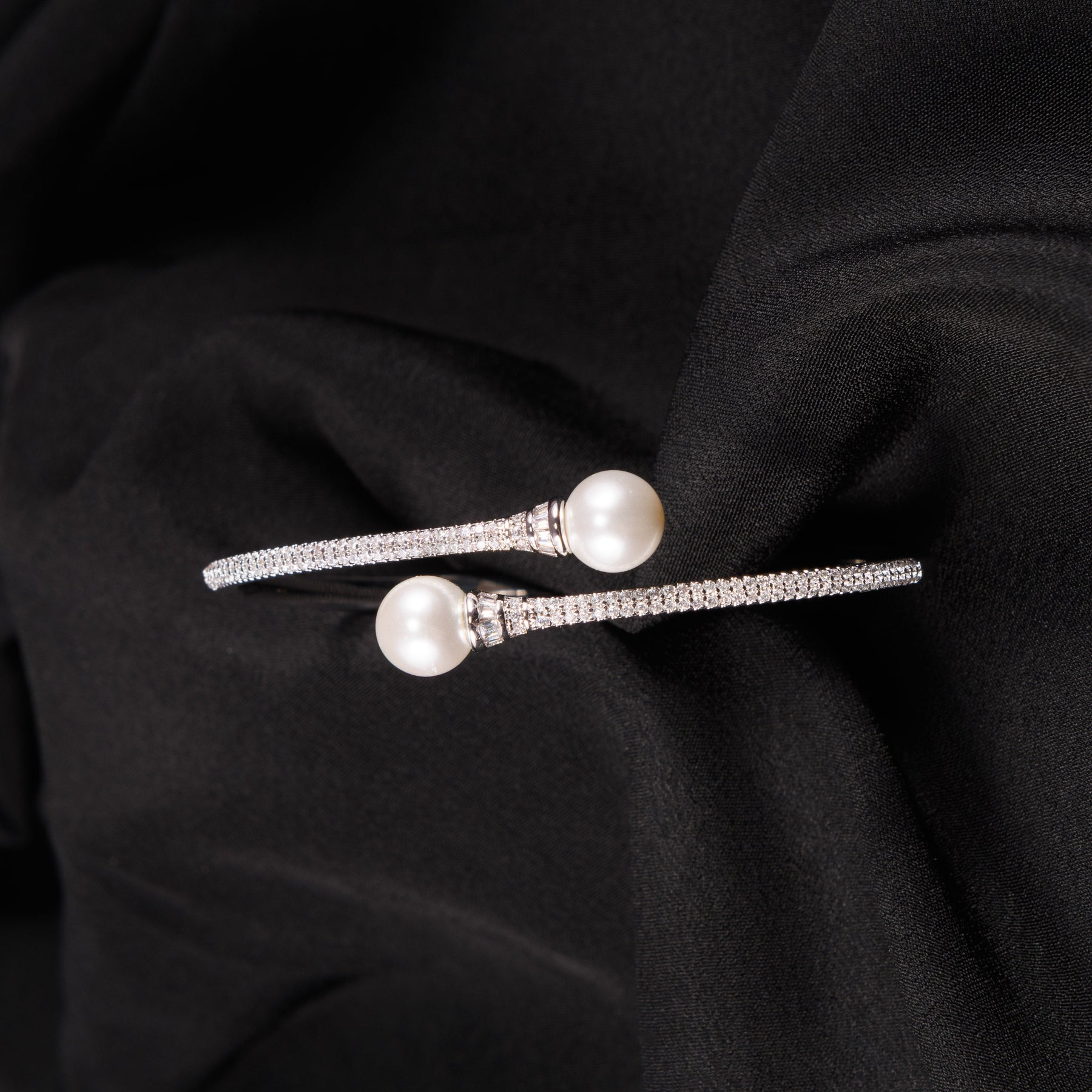 Description: This zirconia cuff bracelet features a graceful open design embellished with sparkling stones and finished with lustrous pearls accent for a touch of classic elegance. The contrast between the shimmer of zirconia and the softness of the pearl creates a refined and timeless look. Lightweight and comfortable, it sits beautifully on the wrist with a sophisticated finish. Perfect for festive occasions, evening wear, or elevating everyday style.