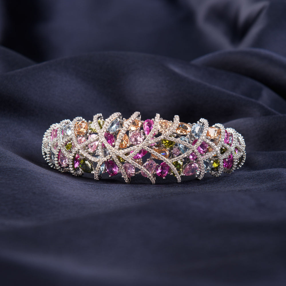 Description: This stunning bracelet features a wide band design, allowing for a bold display of multicolored stones that are expertly set in various patterns which can effortlessly elevate both casual and formal outfits.
