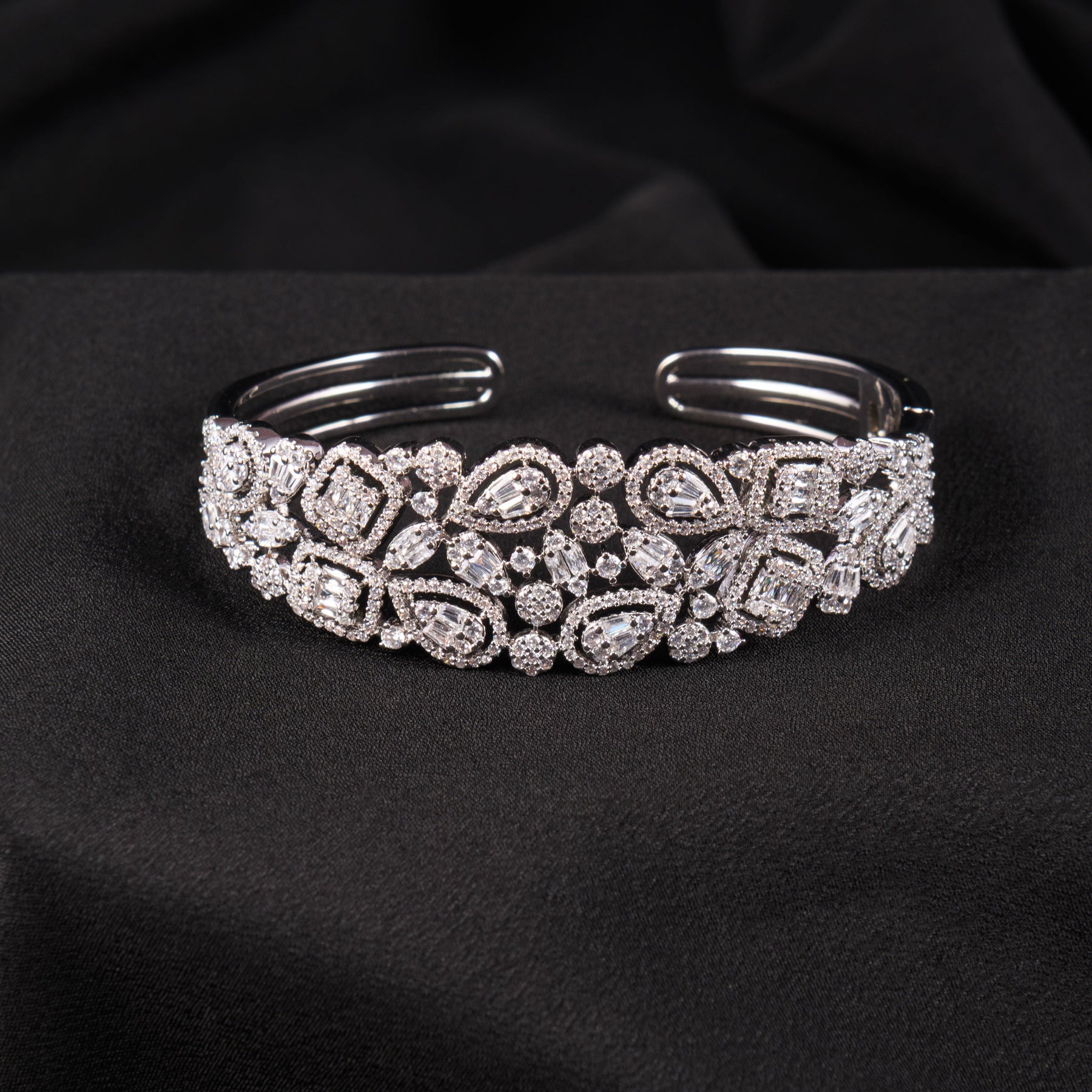Description: A true head-turner, this zirconia cuff bracelet blends modern edge with refined sparkle. The structured design wraps the wrist gracefully while the shimmering stones add just the right amount of drama. Perfect for elevating both Indian and western looks, it brings a luxe finish without trying too hard. Ideal for those who love jewellery that speaks without saying much.