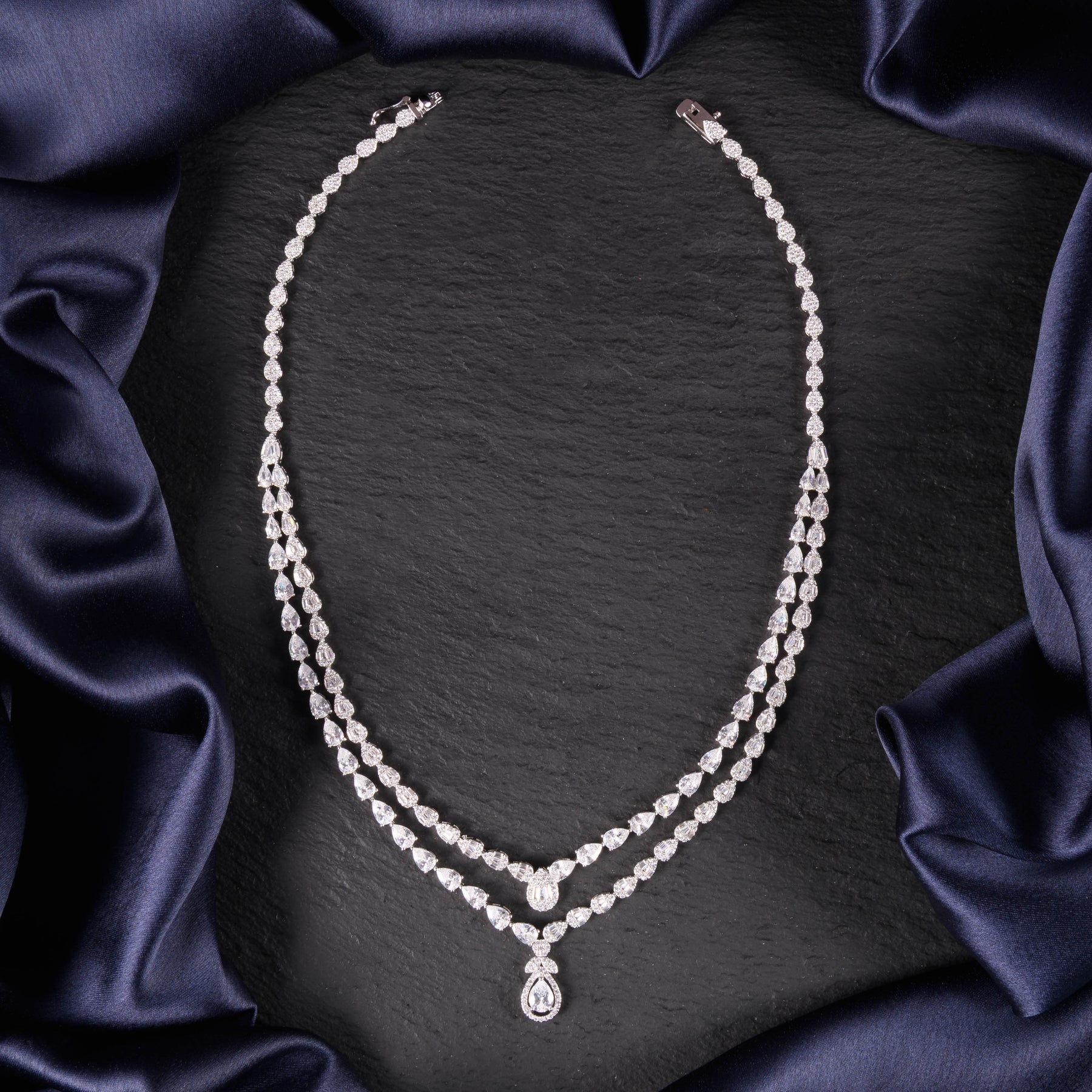 Description: A graceful two-tier design adorned with finely set zirconia stones that shimmer with subtle brilliance. Its layered style adds depth and elegance while keeping the look minimal and refined. Perfect for special evening occasions, this necklace brings effortless sophistication. A versatile piece for women who love understated sparkle.