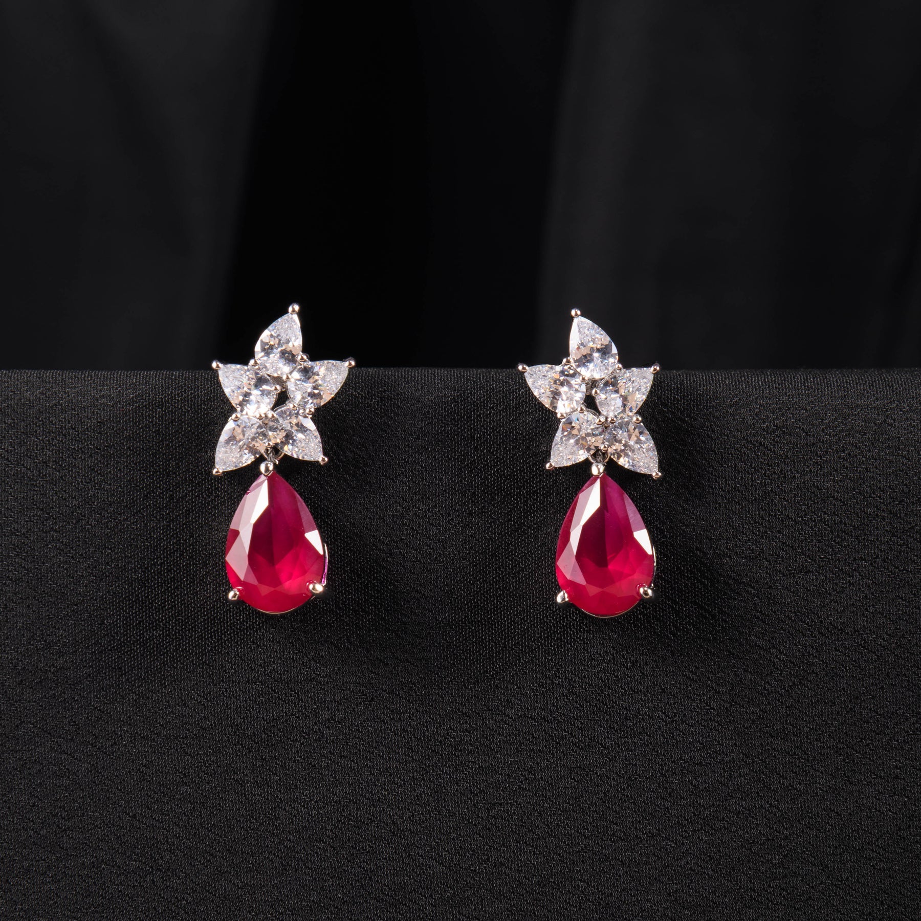 Description: A stunning floral design featuring a cluster of sparkling zirconia stones, beautifully complemented by a radiant drop-shaped coloured stone. The intricate craftsmanship adds brilliance, while the coloured drop brings a vibrant touch of elegance. A captivating pair that blends classic sparkle with a hint of colour.