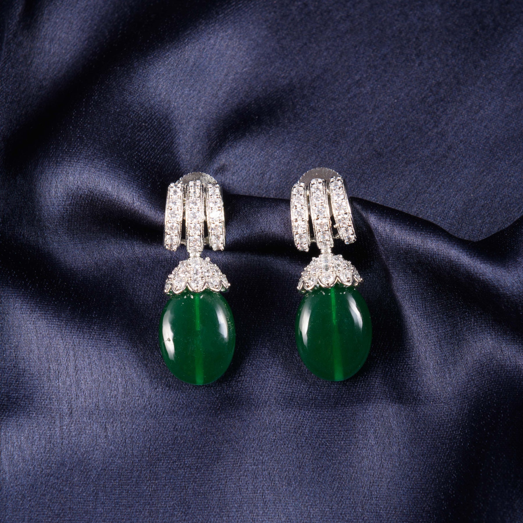 Description: These stunning earrings feature sparkling zirconia studs complemented by a striking semiprecious emerald drop. The blend of brilliant white and rich green creates a luxurious contrast, perfect for both festive occasions and evening wear. Lightweight yet eye-catching, they bring a refined touch of colour to any look.