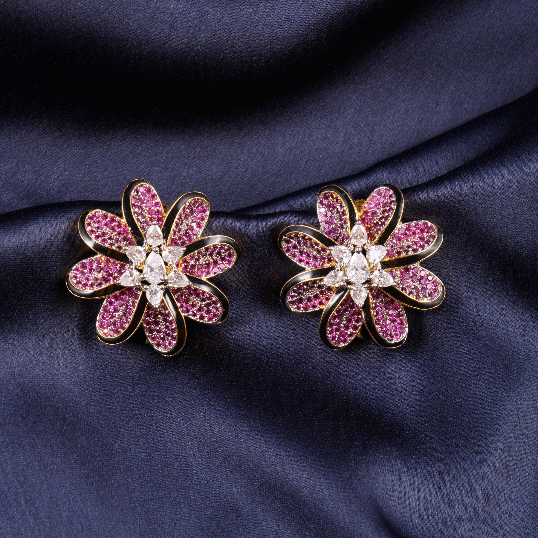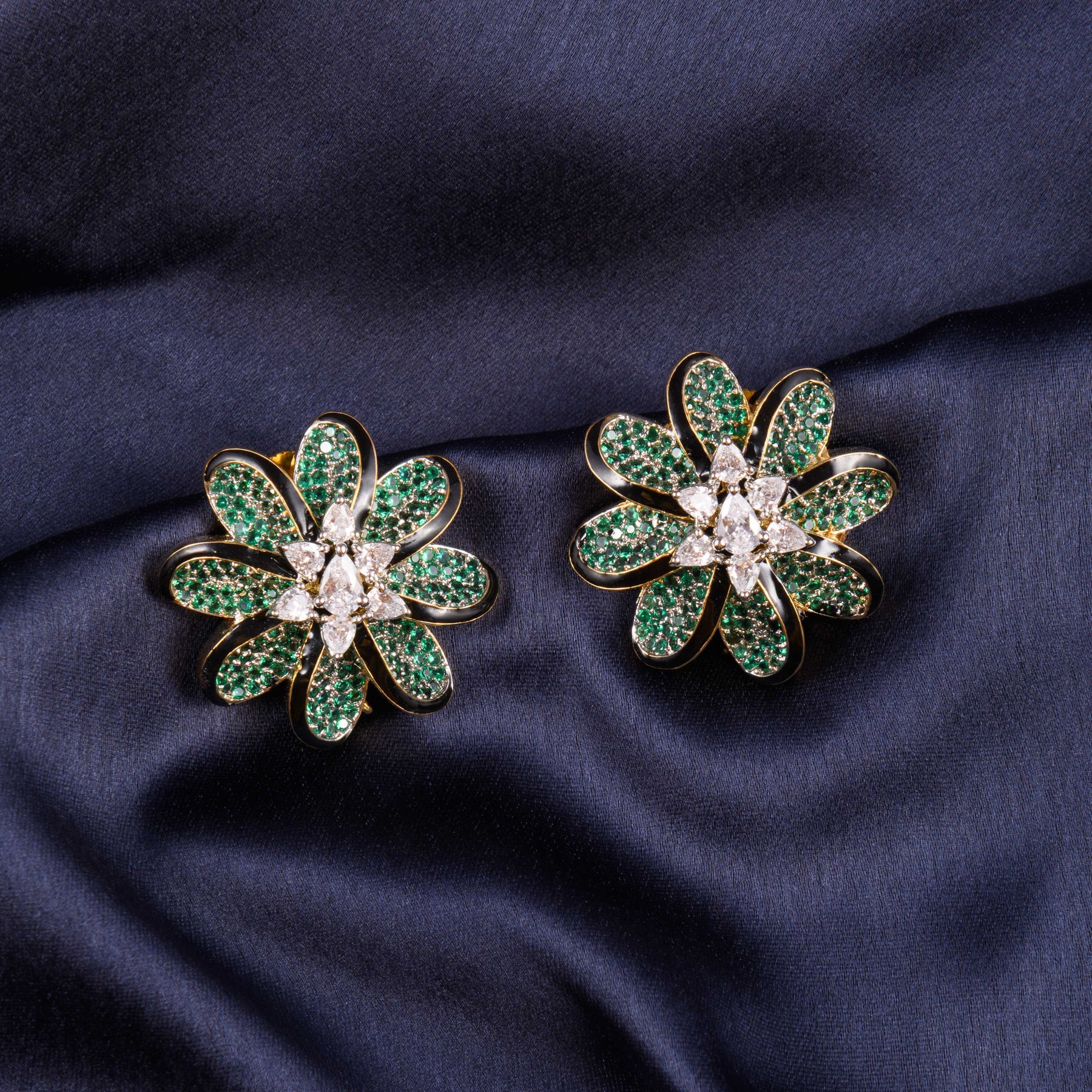 Description: Bold and radiant, these studs feature a striking floral design encrusted with sparkling zirconia stones. Perfect for parties, weddings, and festive occasions, they add a glamorous touch to any look. Despite their statement appeal, they remain lightweight and comfortable to wear.