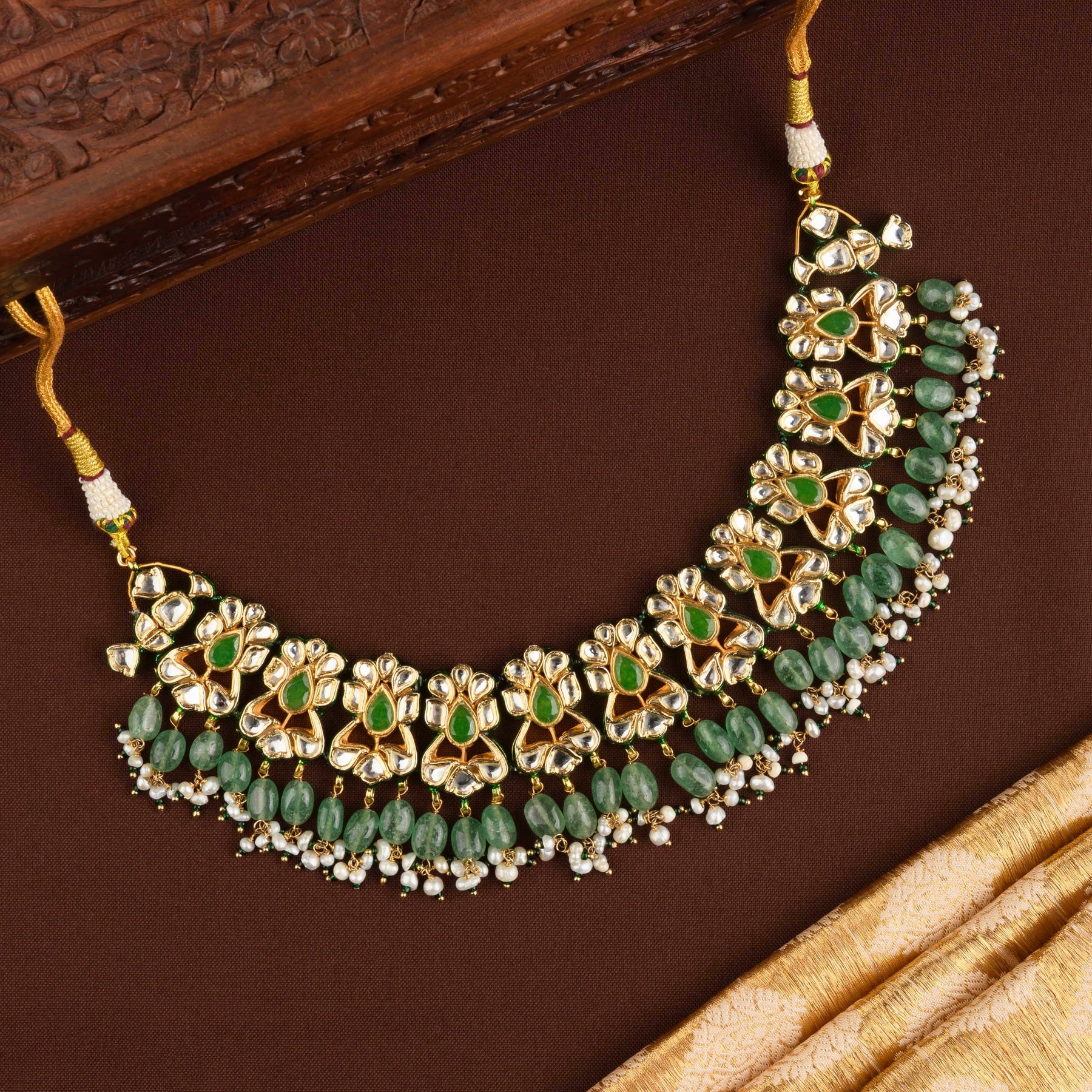 Description: An intricately designed polki and emerald necklace set that exudes regal elegance. The rich emerald accents beautifully complement the brilliance of handcrafted polki work. A timeless statement piece, perfect for bridal and grand festive occasions.