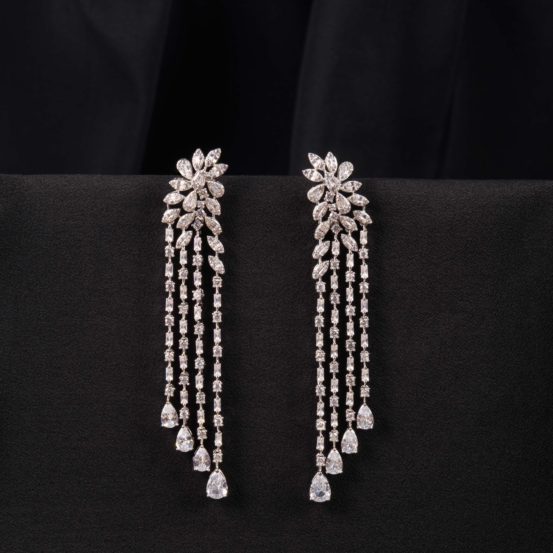 Description: These striking long earrings feature a cascading arrangement of zirconia stones that create a beautiful flow and brilliant sparkle with every movement. The elongated silhouette flatters the face and adds a graceful touch to festive and evening looks. Designed for maximum shine without feeling heavy, they offer both glamour and comfort. Perfect for special occasions, they make an effortlessly elegant statement.