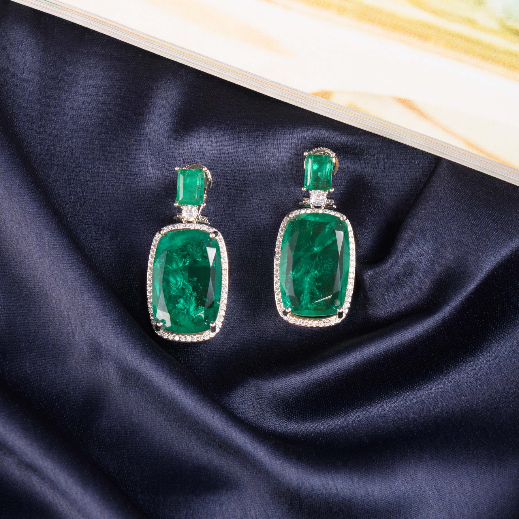 Description: These bold earrings feature a striking big doublet emerald stone, framed beautifully with a shimmering zirconia outline for a luxurious contrast. The rich green hue paired with sparkling accent creates a regal and eye-catching look. Designed for impact, they add instant glamour to festive and evening outfits.