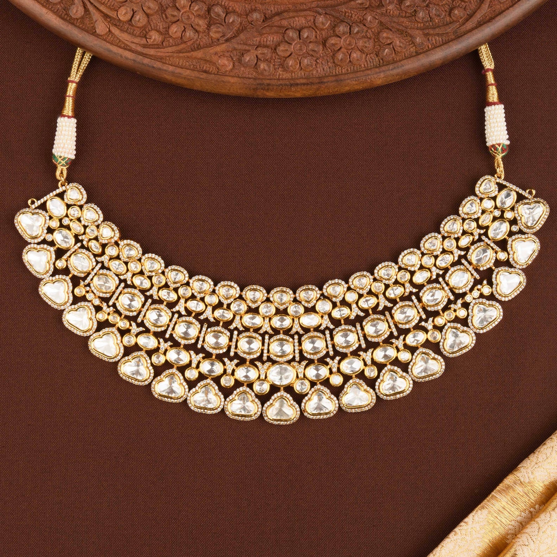 Description: Designed for opulence, this gorgeous polki choker set blends traditional artistry with bold elegance. The intricate detailing and radiant polki work create a powerful, luxurious look. Perfect for brides who want a standout centrepiece.