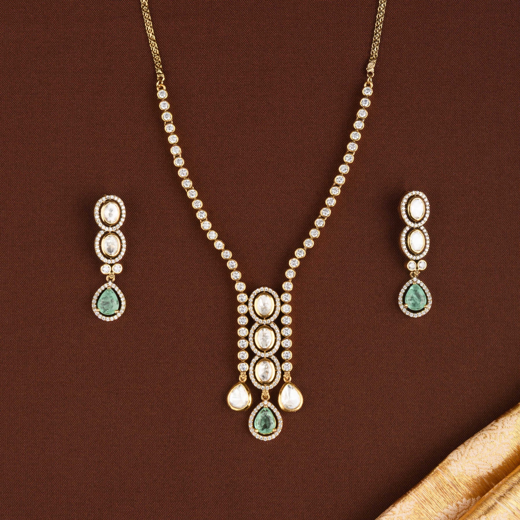 Description: Designed for effortless sophistication, this modern polki necklace set features finely set stones in a stylish, updated silhouette. Its versatile appeal makes it suitable for celebrations as well as elegant evening wear.