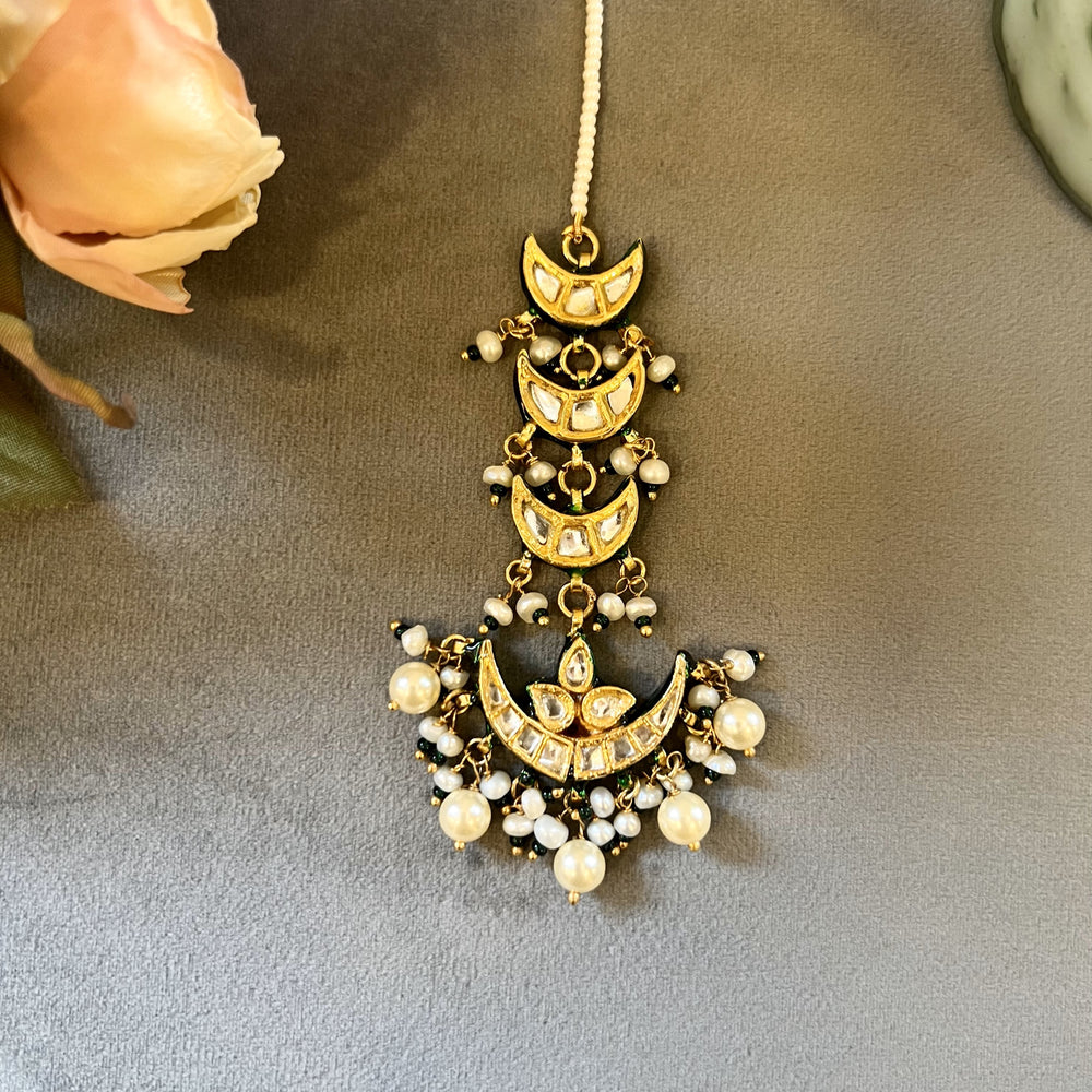 Description: This Vanya Pearl and Polki Mangtikka adds a glamorous and sophisticated touch to any traditional attire, making you the center of attention wherever you go.