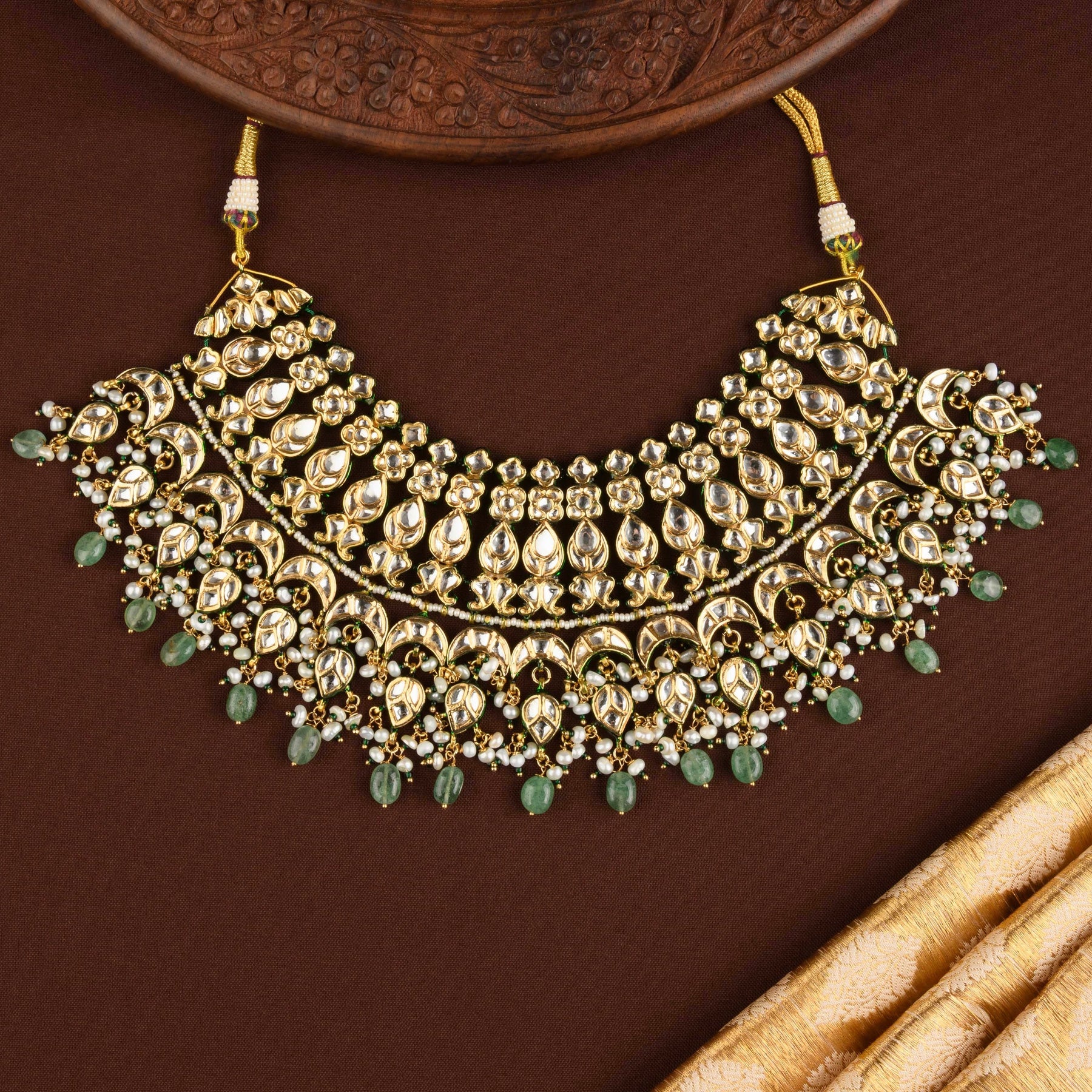 Description: This exquisite pearl and polki bridal set showcases rich craftsmanship with delicate emerald accents in the hangings. The blend of timeless polki sparkle and graceful pearls creates a regal silhouette. An ideal choice for brides seeking elegance with a luxurious finish.