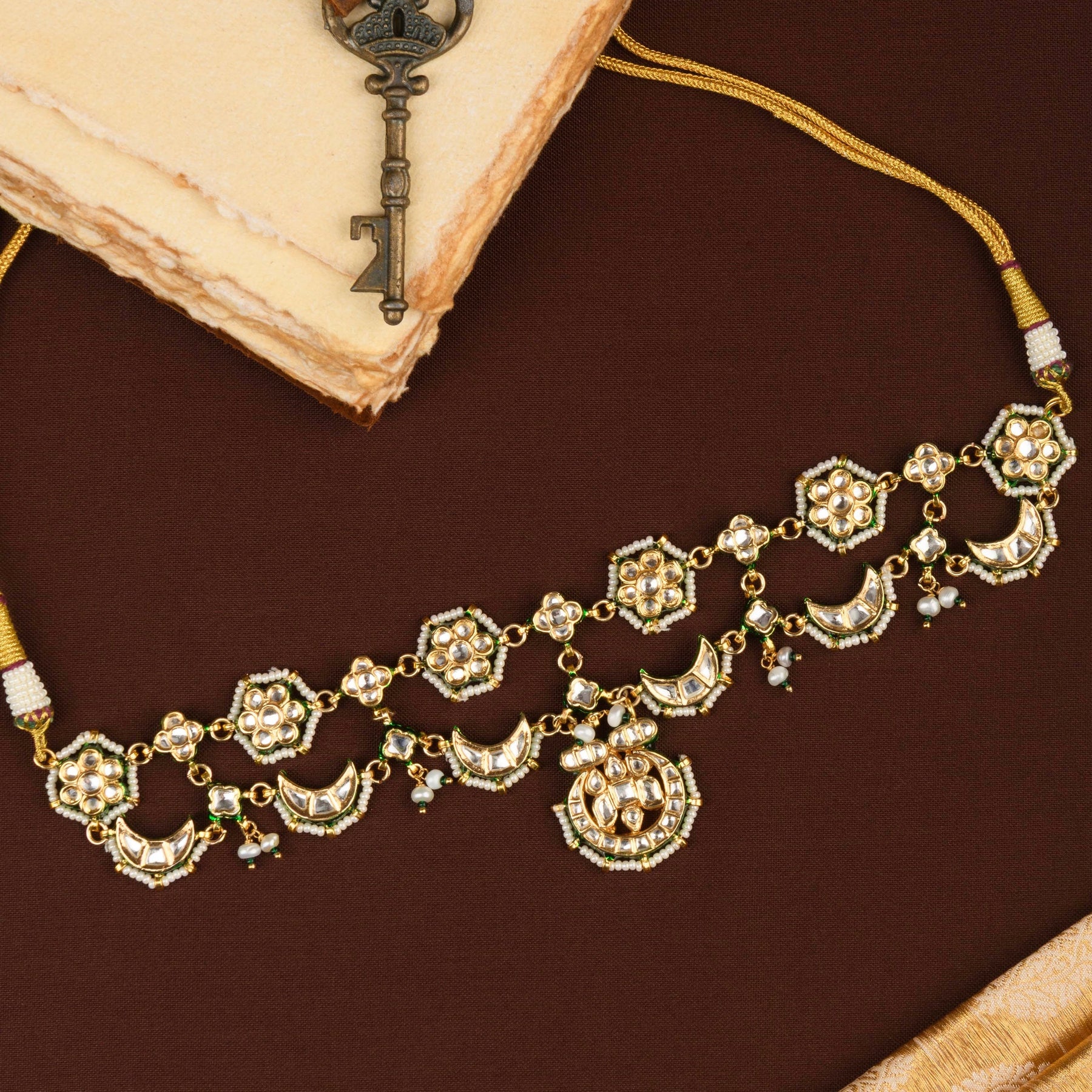 Description: This choker set features intricate polki work intertwined with delicate pearls, creating a design that’s both royal and refined. Perfect for those who love heritage jewellery with an elegant, feminine touch.