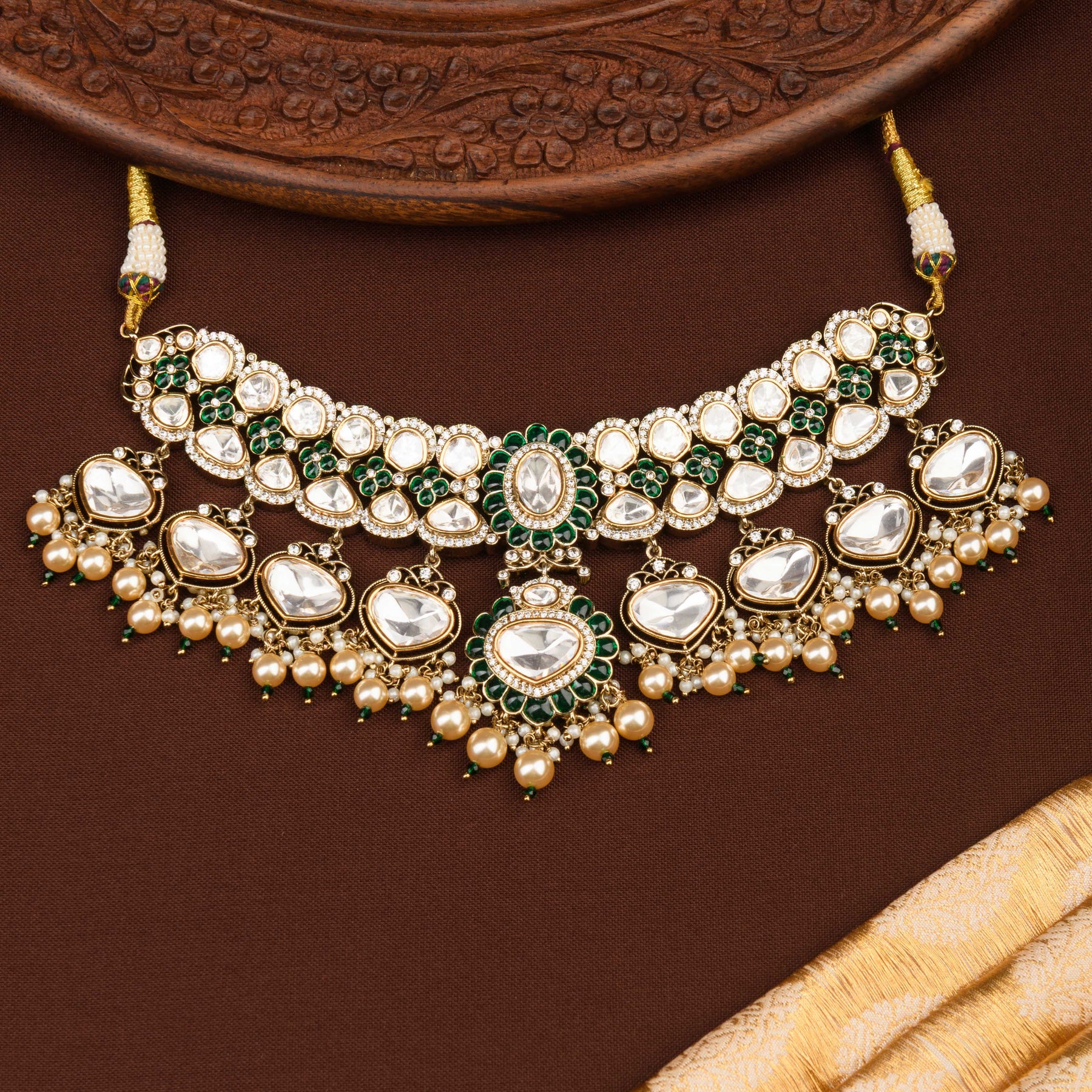 Description: A masterpiece of polki artistry, this beautiful choker set features coloured stone detailing that adds richness and depth. Crafted for wedding celebrations, it brings together heritage, opulence, and exquisite design — a true expression of regal sophistication.