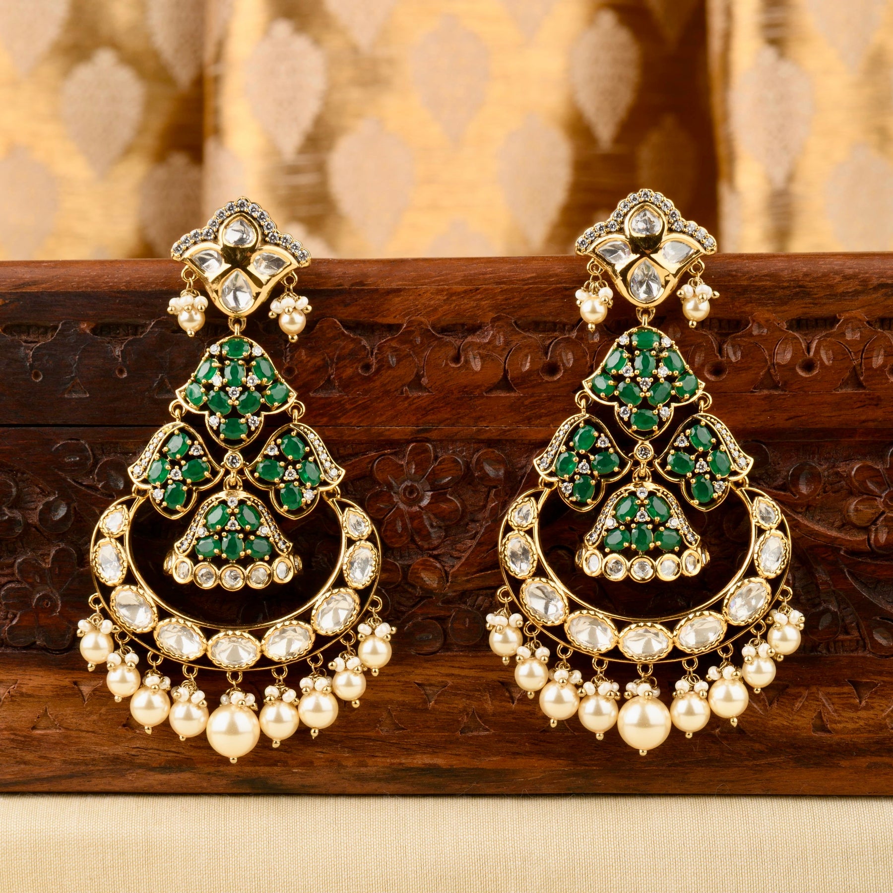 Description: These exquisite polki chandbalis bring together heritage artistry and modern allure. The combination of coloured stones and pearl hangings adds a touch of vibrancy and elegance, making them an ideal choice for special occasions.
