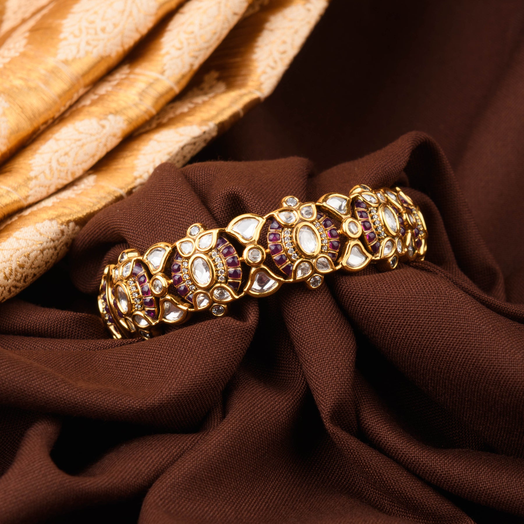 Description: Radiating traditional elegance, this gold-plated polki kada features finely set polki stones that exude vintage charm. The rich gold finish enhances its timeless appeal, making it a perfect accessory for weddings, festivities, and special celebrations. A statement piece that adds effortless grace to any look.