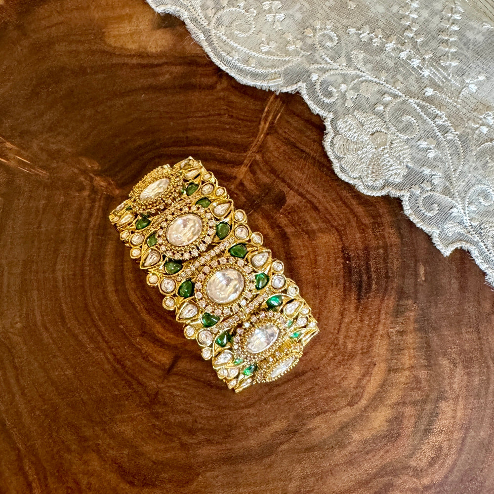 Description: This bold polki kada is a striking piece of traditional jewelry that commands attention with its intricate workmanship. It serves as a powerful symbol of luxury and elegance, making it perfect for weddings, or any special occasion.