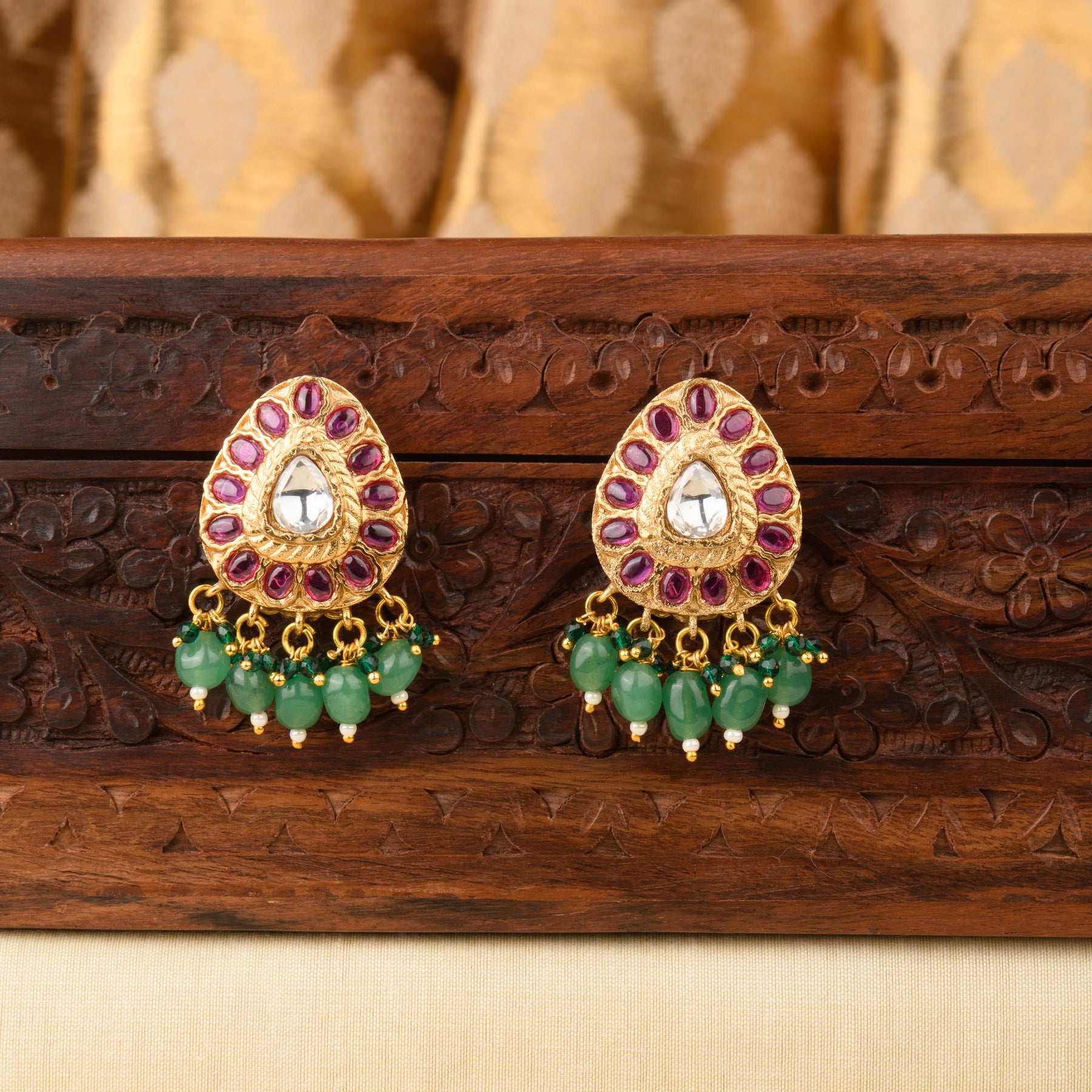 Description: These exquisite earrings beautifully blend tradition and colour. The centre polki stone radiates brilliance, while the ruby outline and green drops add a touch of regal charm and contrast. A perfect statement for ethnic ensembles.
