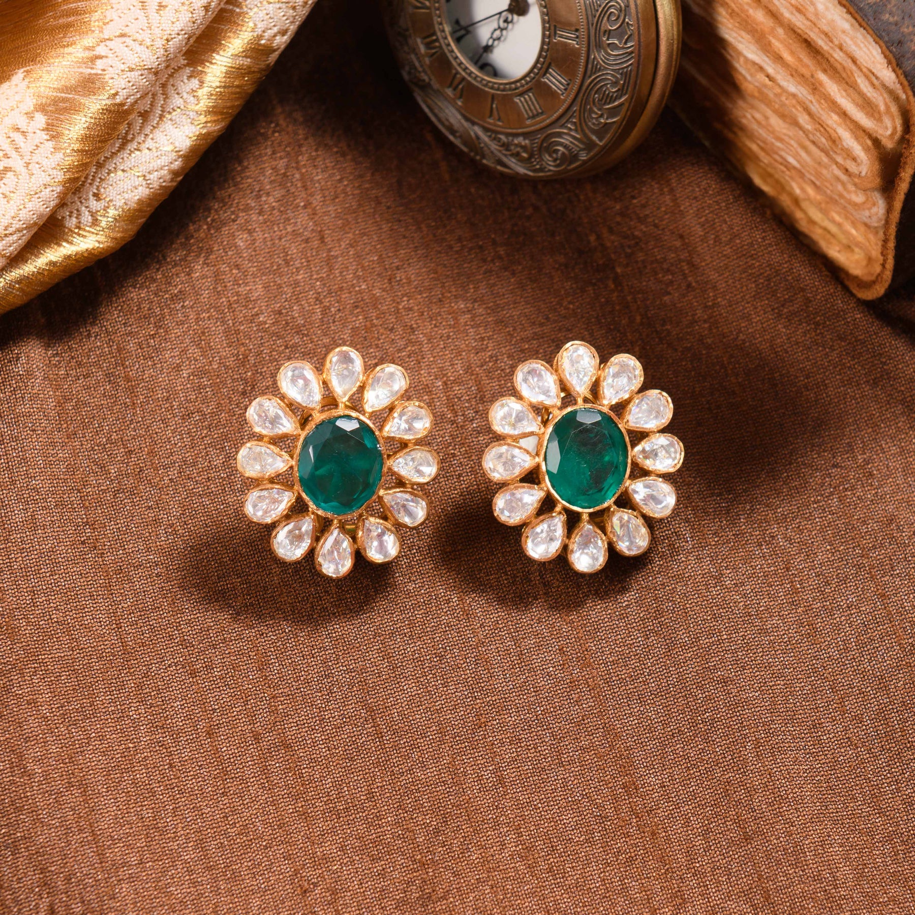 Description: These beautiful polki studs are highlighted by a vibrant central stone that adds character and charm. A timeless design that effortlessly complements sarees, suits, or even modern ensembles.